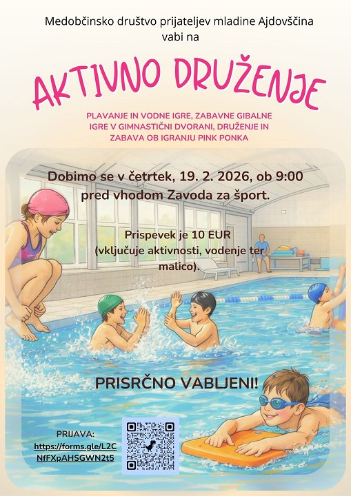 Medobčinsko društvo Ajdovščina v času zimskih počitnic vabi osnovnošolske otroke na prijetno, aktivno in zabavno druženje! V četrtek, 19. februarja 2026, bomo skupaj preživeli pester počitniški dan, razdeljen v tri dele: obisk bazena – plavanje in vodne igre gibanje v gimnastični dvorani – športne in gibalne aktivnosti skozi igro zabavno igranje namiznega tenisa Dan bo namenjen gibanju, druženju ter spodbujanju veselja do športa v sproščenem, varnem in spodbudnem okolju. Kdaj: 19. 2. 2026, od 9.00 do 15.00. Malica: vključena. Cena: 10 € na otroka. Prijave: preko QR kode ali spletnega obrazca https://forms.gle/Um8JbCgZiSPxnqrE7 Veselimo se vaše udeležbe in skupnega počitniškega doživetja!